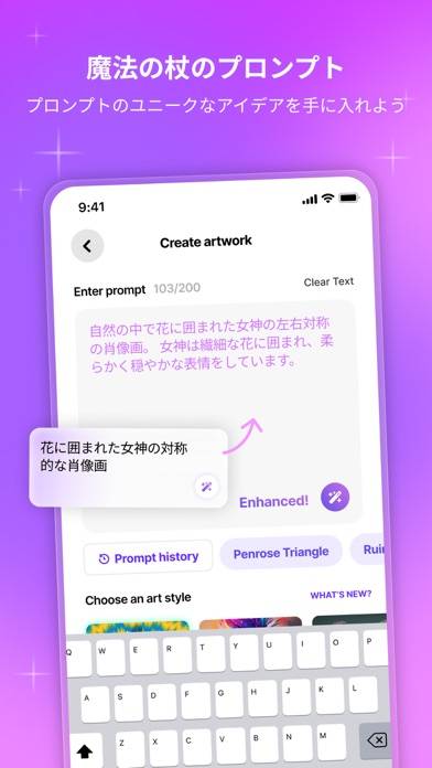 キーワード&アートスタイルを選ぶだけで、AIが美しいアートを作成。パステルや浮世絵風といったさまざまなスタイルを収録しています。何気ないキーワードを入力するだけでも、アーティスティックな仕上がりになるのが魅力。