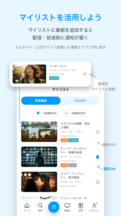 お好みの時間に通知設定をすれば、番組の開始をお知らせしてくれます。見たい番組が多い場合は、カレンダーで管理するのがおすすめ。放送日がひと目でわかるようになります。