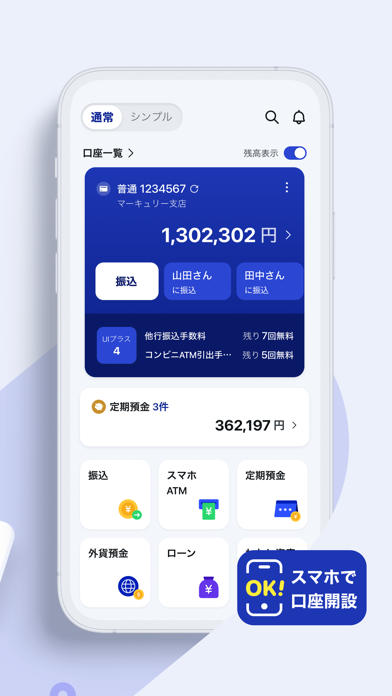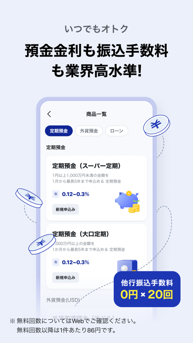 - 定期預金や外貨預金などの手続きもスマホで完結。資産運用にも使える