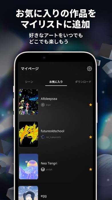 「ホーム」または「ギャラリー」画面で、注目の作品を探せます。先ほどのエイリアンのARのほか、街並みを模したVR、ミュージックビデオ風のVRなど作品の方向性はさまざま。会員登録をすれば、フォローやお気に入り機能が使えるようになります。