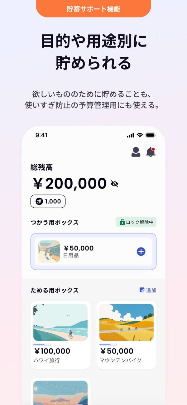 - 「ボックス」で入金額を細分化。支払いと貯蓄を区別し運用可能