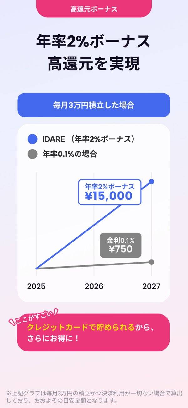 趣味のカメラを買うために貯金をはじめました。魅力は年率2%のボーナス。何もしなくてもどんどんたまっていくのが嬉しいです。余計な機能がなくてシンプルで使いやすいのと、現物のカードも発行できて便利。毎日増えていく貯金を見るのが楽しみで、目標を早く叶えられそうです。