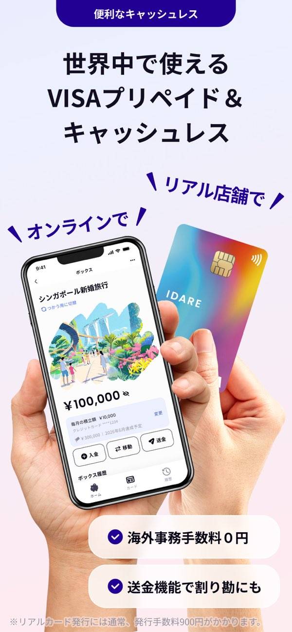 キャッシュレスが主流の国へ行くと、交通機関も含めあらゆる場所でクレカを使う事になるので、不正利用などのトラブル防止策として、IDAREでカードを作りました。1番のメリットはリアルカードがVISAのタッチ決済に対応してること。海外滞在中にアプリ内で日本の銀行口座からチャージ可能だし、残高は即時反映されるので外貨で決済した際の金額確認もその場でできて安心。デザインもスタイリッシュで◎