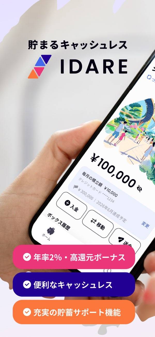 クレカからチャージできて、残高に応じて年率2%のボーナスがもらえるので、クレカ修行などで一時的にお金を使いたいけど、今すぐ別に買うものが無いみたいなときに便利。こういう系のアプリやサービス全部で欲しいけど、他であまり見ない入金に使うクレジットカードに名称をつけられる機能がめちゃくちゃありがたい。