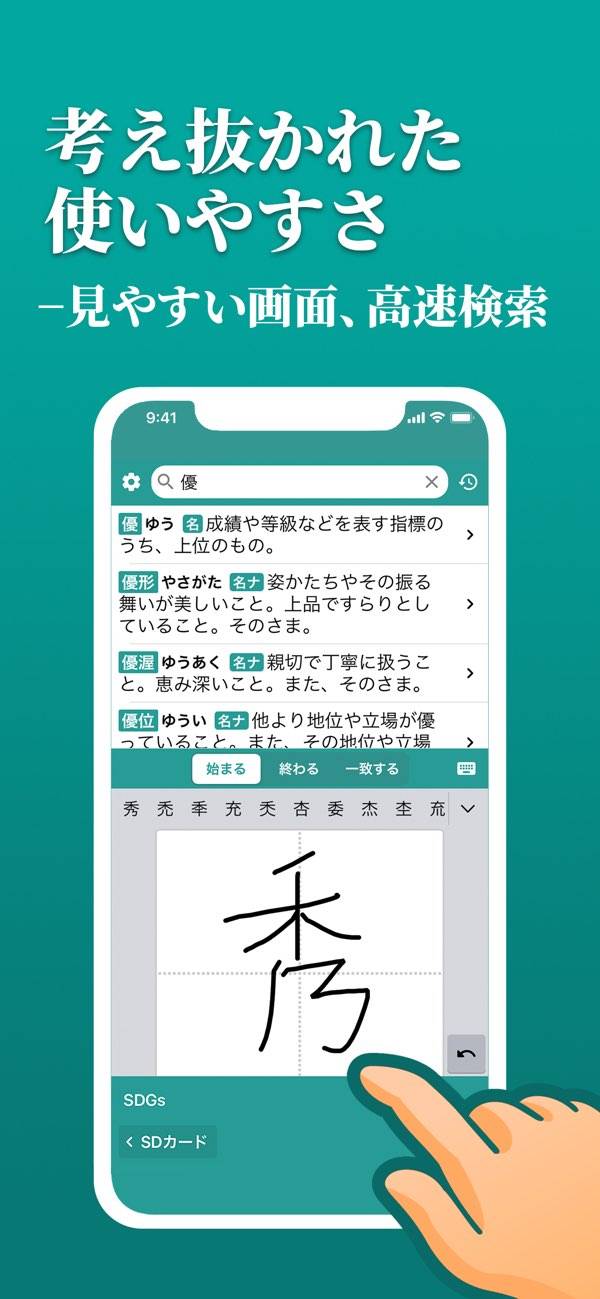 読み方がわからない語句でも手書き入力で検索できます。書いている途中でも候補を表示してくれるので、目的の漢字がすぐ見つかるでしょう。また音声入力にも対応しています。