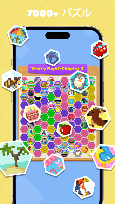 六角形のパネルが並ぶ画面から問題を選択します。マス数と難易度を見てから問題を選べるので、自分のレベルや時間的な余裕に合わせた遊び方が可能。問題をクリアするとパネルが完成したイラストに変わっていき、達成感もいっそう増します。