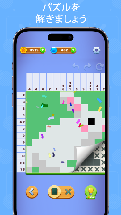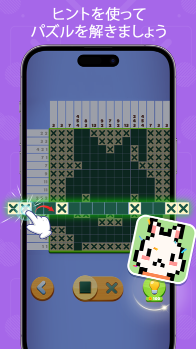 タップやドラッグでマス目を塗ったり、バツをつけたりできます。操作はオーソドックスで、ミスしても特にペナルティがないためお手軽。完成後のイラストにカラーがつくのも特徴。どんなイラストができあがるか、ワクワクしながら解けます。