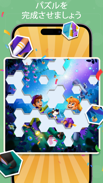 問題をクリアするたび手に入るピースでジグソーパズル。ピースは六角形をしているので、通常のジグソーパズルとはまた違った感覚で遊べます。完成に必要なピースも多いのでやりごたえは十分。ロジックの息抜きに遊ぶのにはぴったりです。