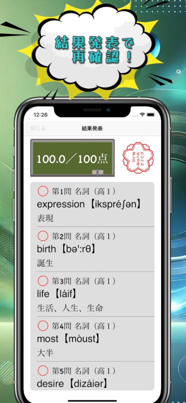 ゲーム感覚で英単語を楽しく学べるのが魅力。英単語に関する問題が1,300問以上収録されています。高校1年生レベルからなので難しすぎて挫折なんてこともありません。ランダムに出題される問題を解き、4回連続正解するとその問題は出題されないため、新たな問題に集中して学べます。