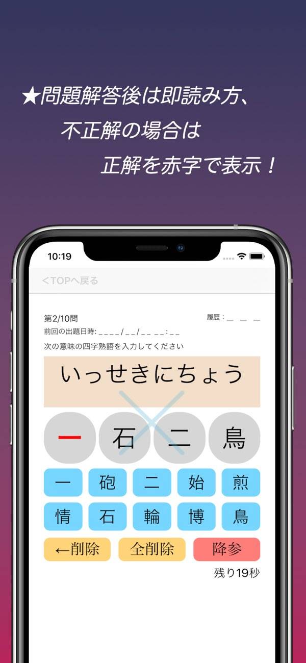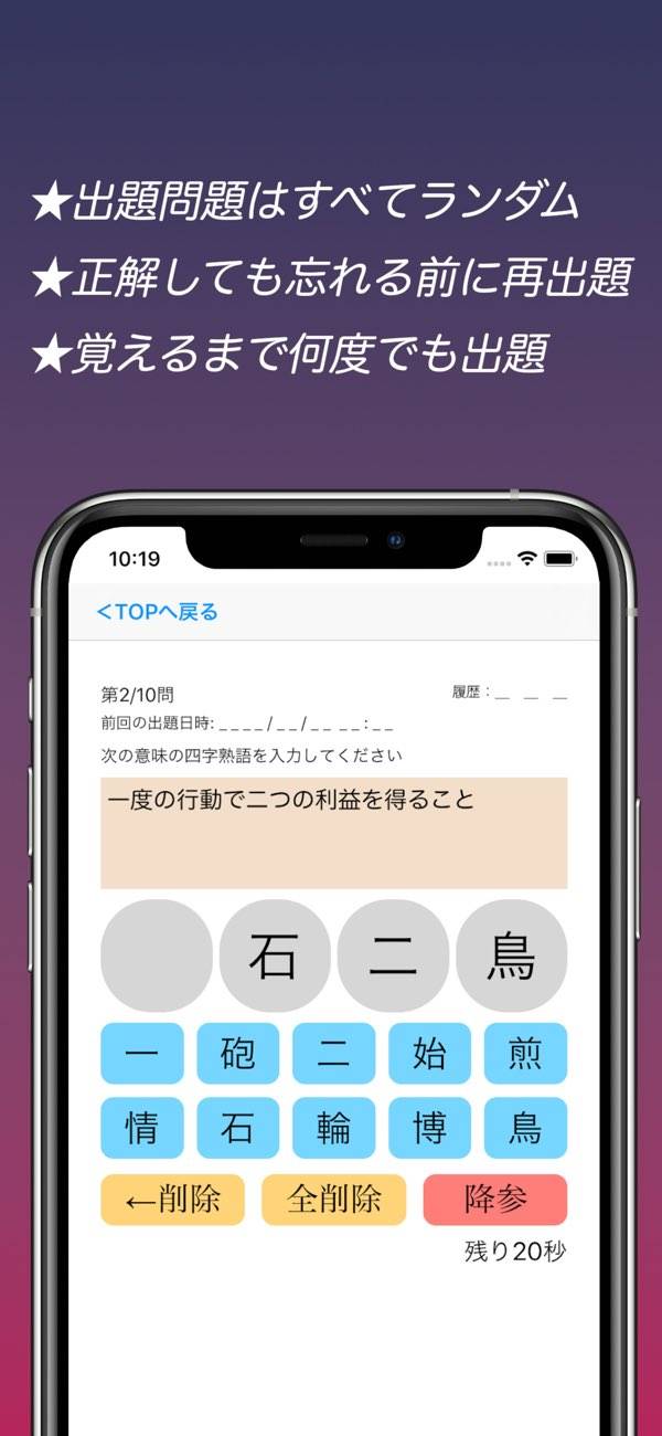 - 連続正解した四字熟語は出題されなくなる。苦手な熟語だけを練習