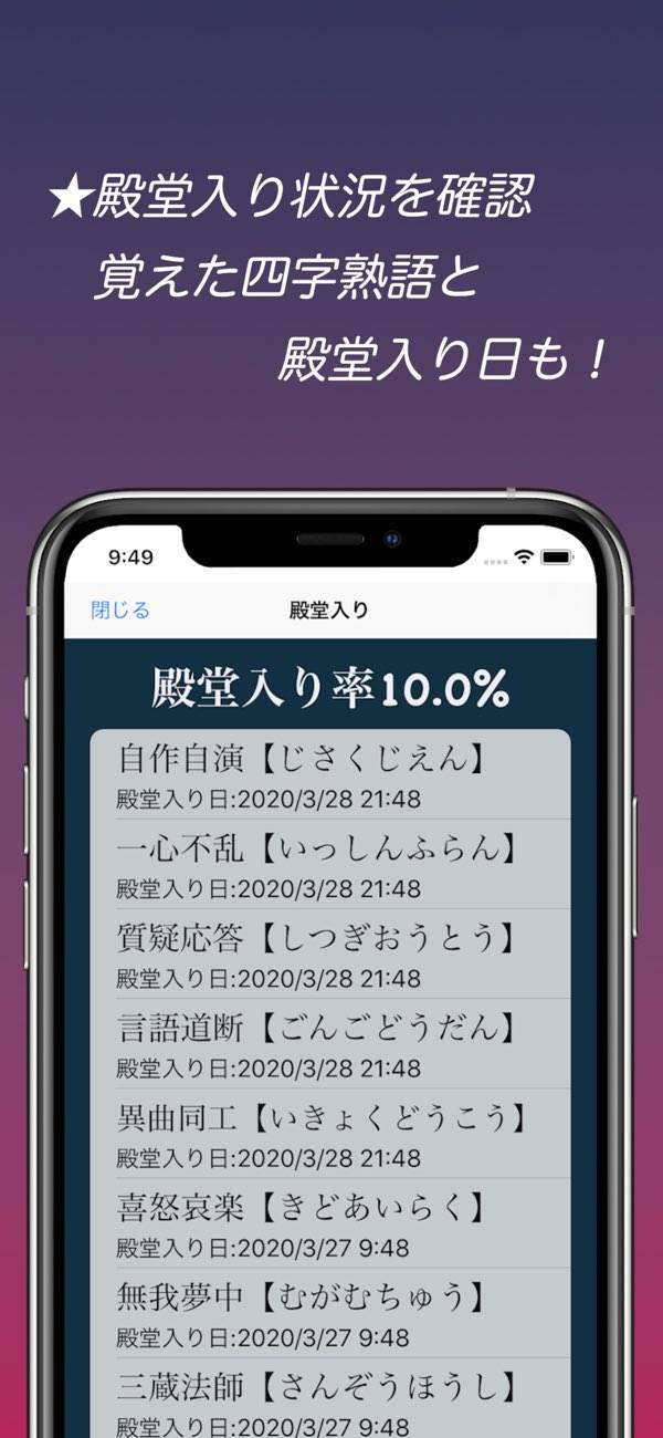 4回連続で正解した四字熟語は、「殿堂入り」に登録されます。殿堂入りになった四字熟語は出題されなくなる仕様。覚えられない四字熟語だけが出題されるようになっていく、独特のシステムになっています。