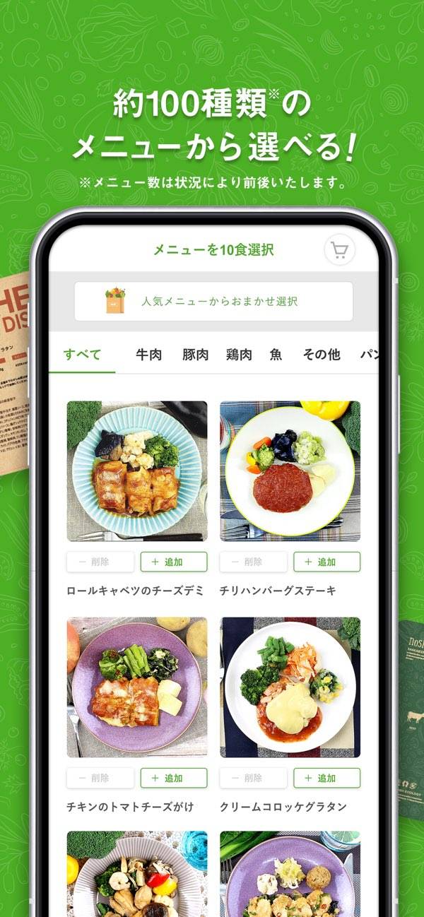 60種類以上の食事・スイーツから、メニューを自由に選べます。和・洋・中のメインディッシュをはじめ、ロールケーキなどのデザートもラインナップ。毎週新しいメニューが追加されるため、飽きる心配もないでしょう。