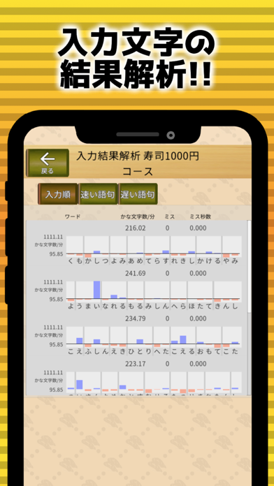 ゲーム通じ、フリック入力を楽しく習得していけます。流れてくる寿司ネタに対応した文字を正確に入力するシンプルルール。早く入力すると制限時間が増えるルール。これがまた絶妙な塩梅で、より長くプレイできるようになろうと、やりこみ魂に火を付けてくれます。