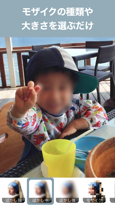 ぼかし弱~強、モザイクなど6種類のモザイク加工ができます。画面下部の太さor大きさをタップすると、範囲の大きさが変更可能に。難しい操作もなく広告も少ないため、使いやすいのが魅力です。
