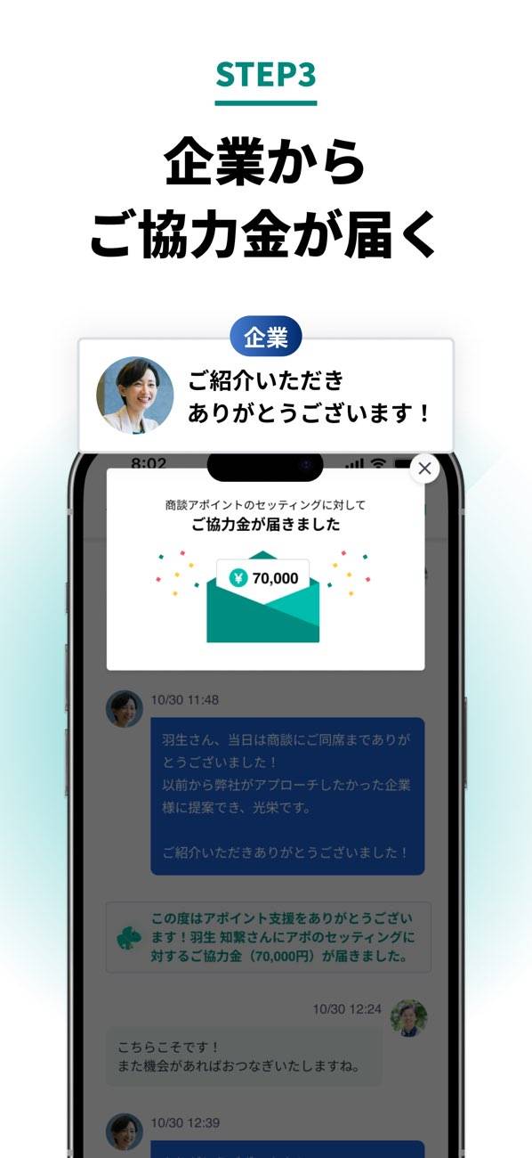 知り合いを企業に簡単に紹介できる機能が特徴です。アプリ内で商談アポイントのセッティングができ、紹介先の企業から協力金を受け取れます。つながりを活用して企業の成長を支援することが可能。