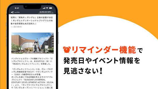 あらゆるガンダム関連の情報がつまった公式情報アプリです。アニメやガンプラはもちろん、ゲームからコミックまで、ユーザーの興味関心に合わせた最新情報をお知らせ。リマインダー通知を個別に設定し、イベントの開催日やゲームの発売予定日も逃さずチェックできます。