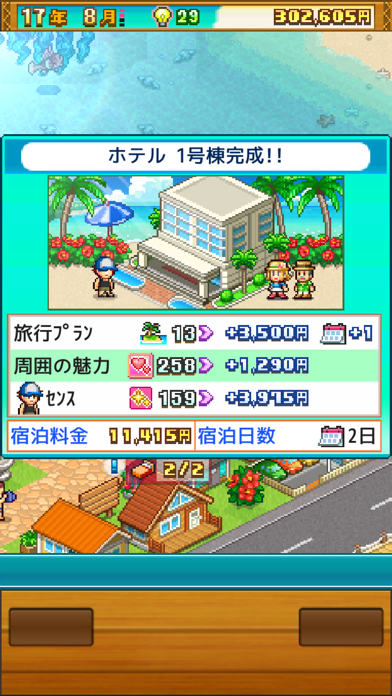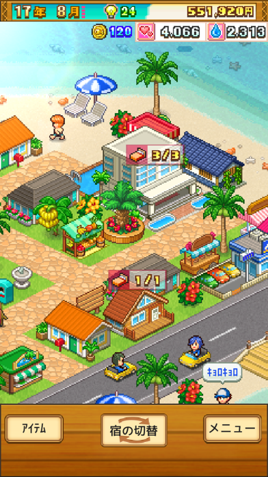 ドット絵と南国のBGMがバカンス気分を盛り上げてくれます。まずはコテージを建ててお客さんを迎える準備をしましょう。ゲームが進むスピードはゆっくりですが、それがまたのんびりしていてGOOD!