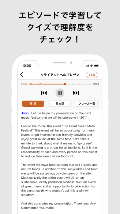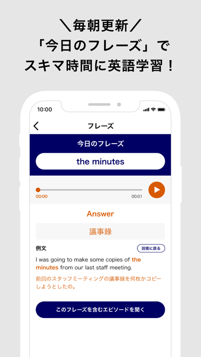 エピソード音声を聞き、出てきた単語や文章について問題に答えましょう。音声は特定のエピソードに沿ったもので、実践的な会話の流れも理解できます。文章は日本語と英語を切り替えられるので、意味やスペリングを覚えやすいのもポイント。