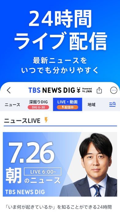 幅広い情報を手に入れたい方に最適な、TBS提供のニュースアプリ。リアルタイムでのプッシュ通知機能により、地震や津波などの災害発生時には即座に知らせてくれます。また、24時間体制のLIVEニュース配信で世界中の出来事を確実にキャッチ。