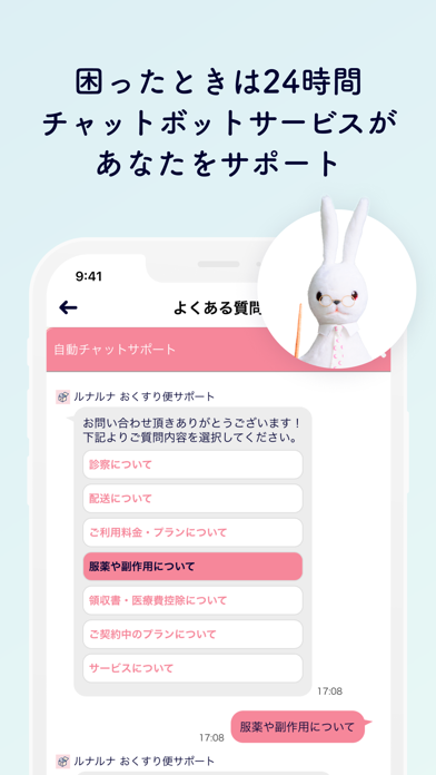 アプリ内で24時間相談可能なチャットボット機能を搭載。服用時の疑問やトラブルにすぐ対応してくれます。また、飲み忘れたときの対処やよくある副作用などについての解説もあり、安心して服用できます。