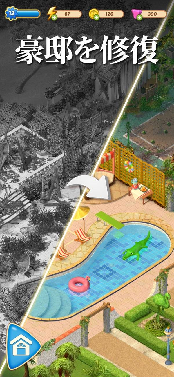 廃墟同然から豪邸へ マージパズルを通じ屋敷を復活