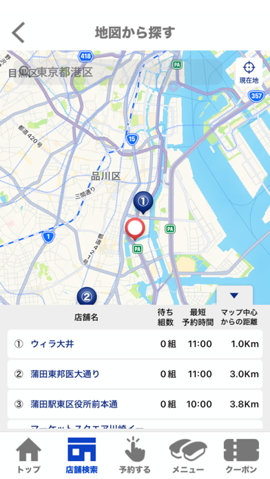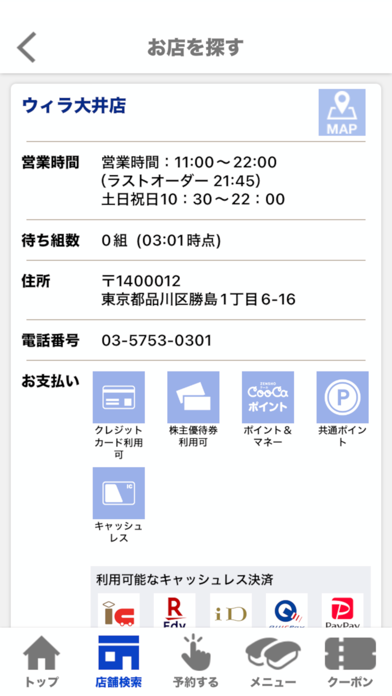 ▲店舗検索ではラストオーダーの時間や、営業時間をチェックできる。混み具合も見られて便利。