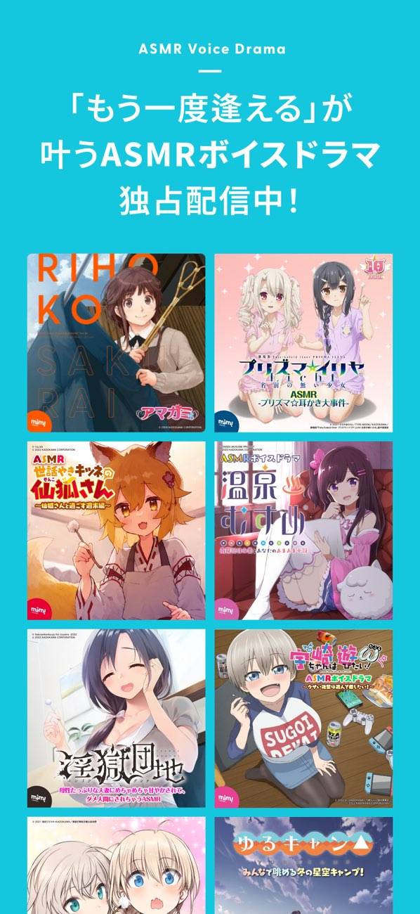 ラノベ・マンガ原作のボイスドラマやASMRボイスが聴けます。ここでしか聴けない独占コンテンツも多くあり、ジャンルも多彩。著名な作品だと「薄桜鬼」や「アズールレーン」などのボイスも配信しています。