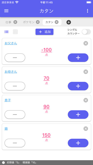 項目ごとにカウンターを設定でき、ひとつの画面にまとめて表示されます。100や1,000など大きい数字の場合は直接書き込めるので便利。使い勝手が良く操作しやすいのが特徴です。