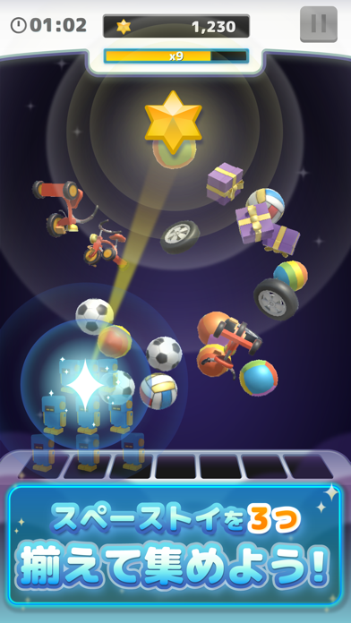 同じおもちゃを3つ探し出し、タップしていくだけのかんたんなルール。小さいお子様からお年寄りまで、誰でも遊べるパズルゲームです。ステージを進めていくと漂うおもちゃの数が増えていき、どんどん複雑になっていきます。
