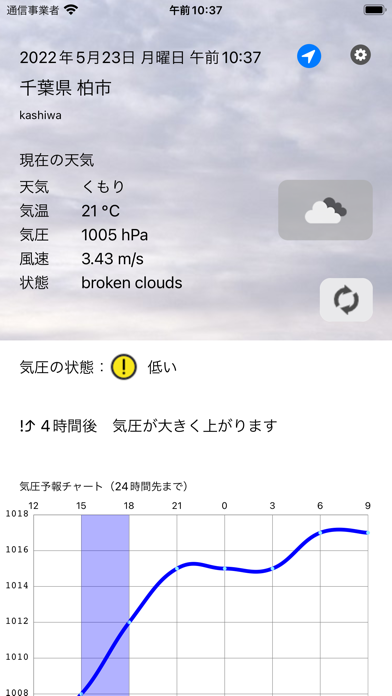 最新の気圧情報をリアルタイムでチェックし、頭痛対策に役立つアプリ。直感的なグラフ表示で気圧変動がひと目でわかり、未来の天気予報も把握できます。天気予報も見られ、その時の天気の映像が背景として表示されるので、どんな天気かぱっとわかります。