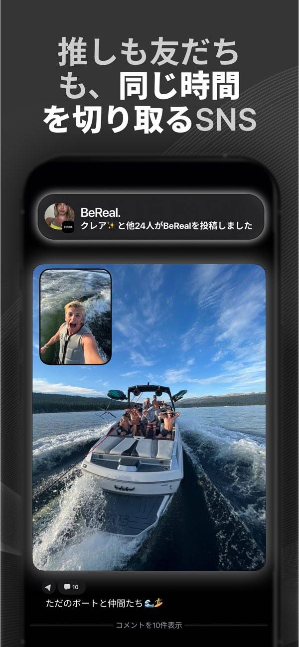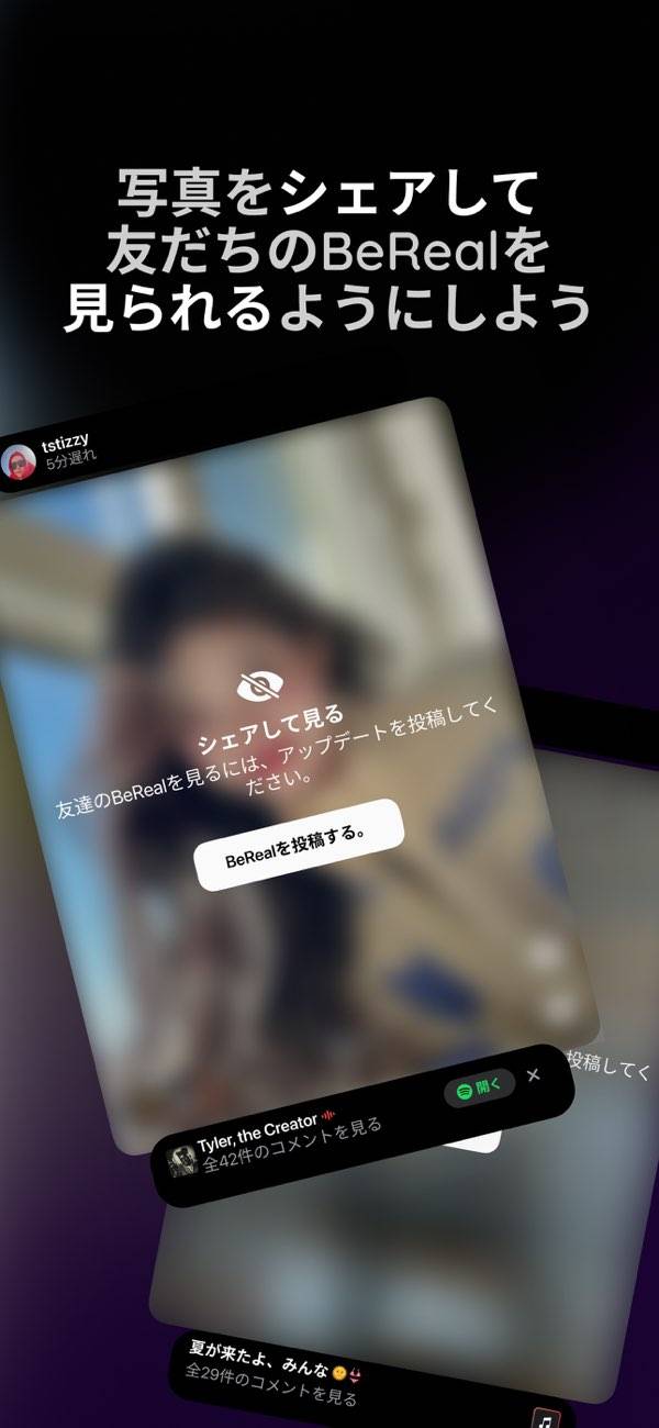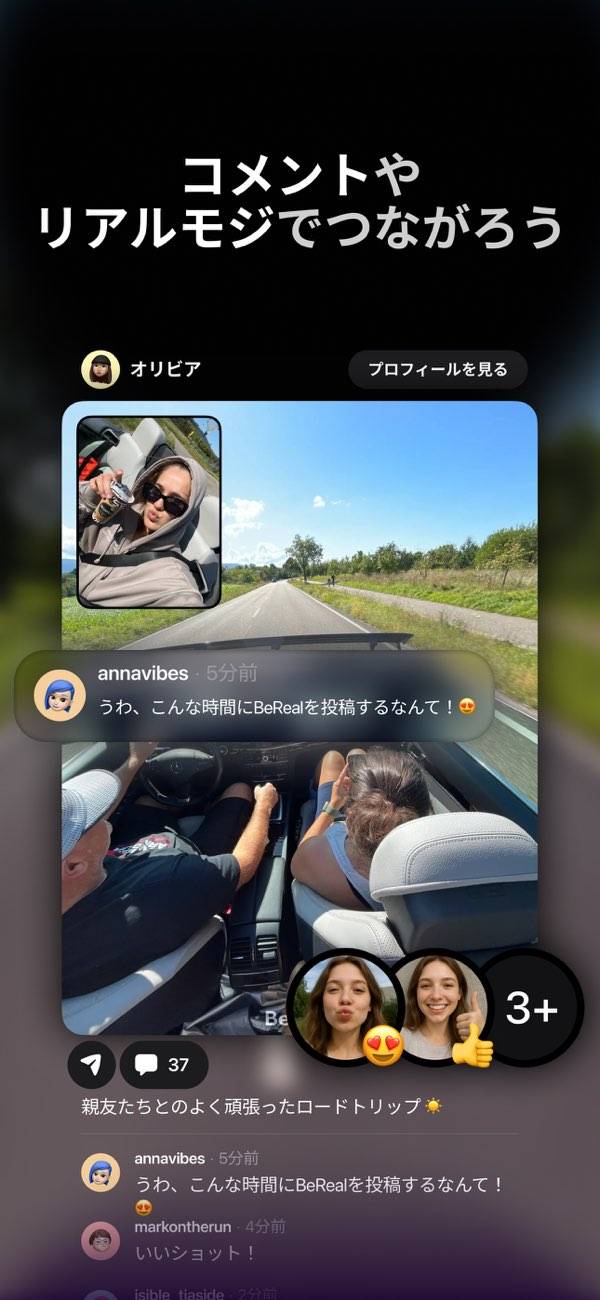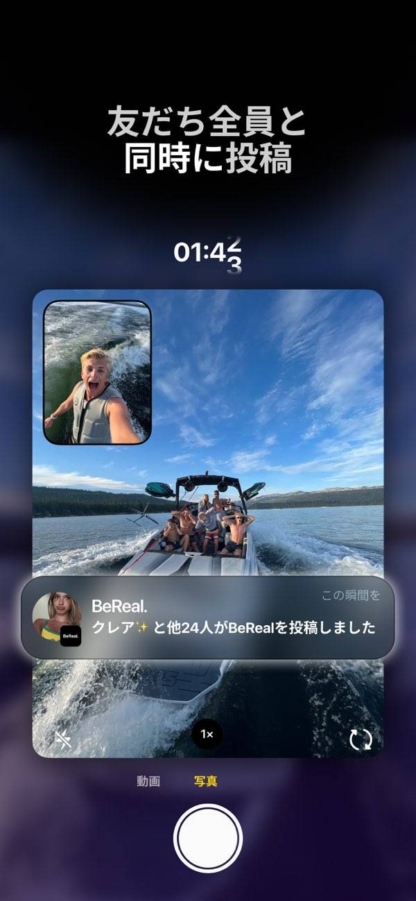 InstagramやTikTokのような加工やフィルターは一切なく、飾らない等身大の自分を共有可能。友達の投稿を見るには自分も投稿する必要があり、投稿は通知から24時間で消えるため、SNSに縛られすぎることなく気軽に楽しめます。