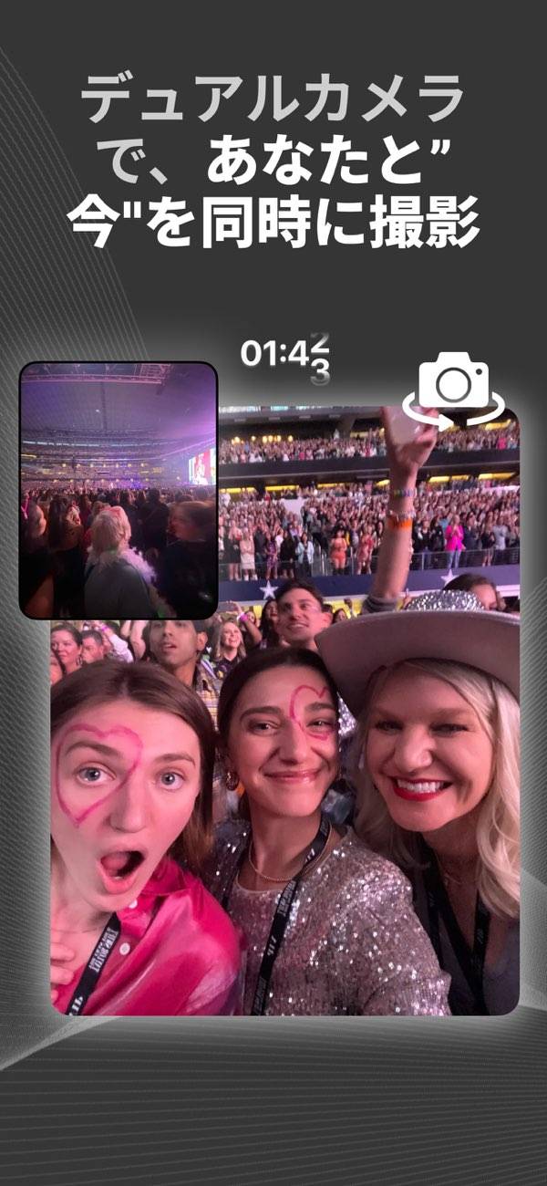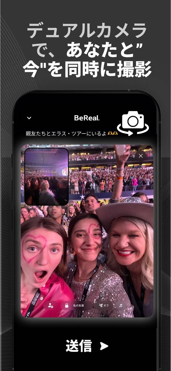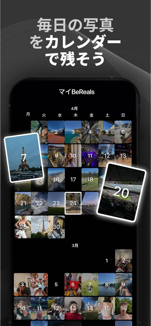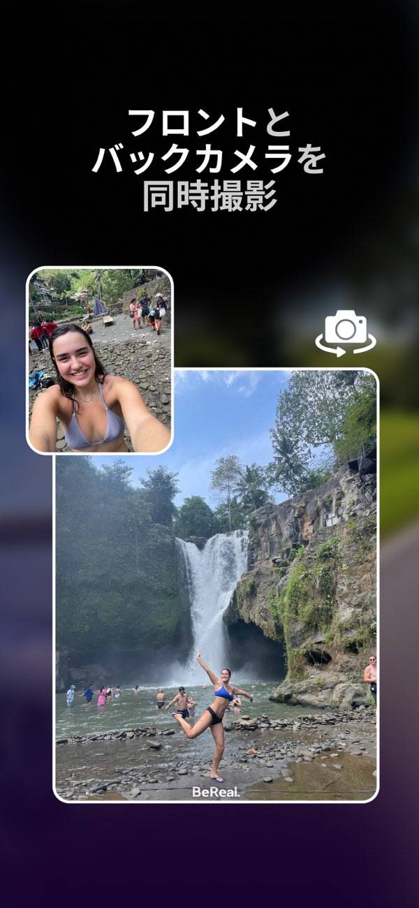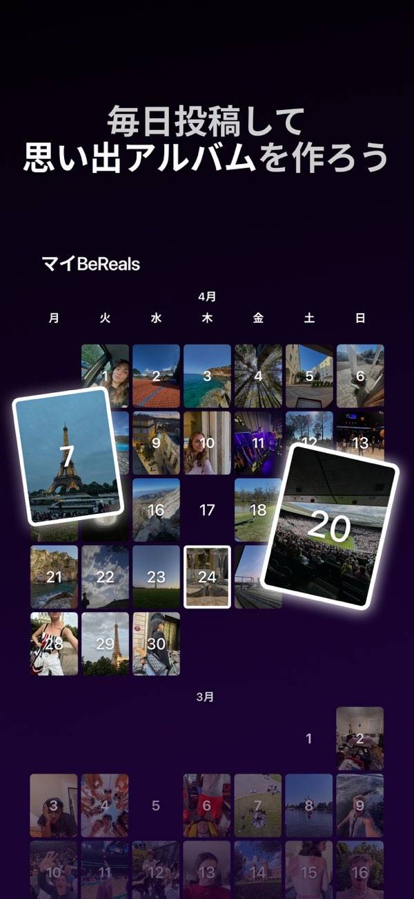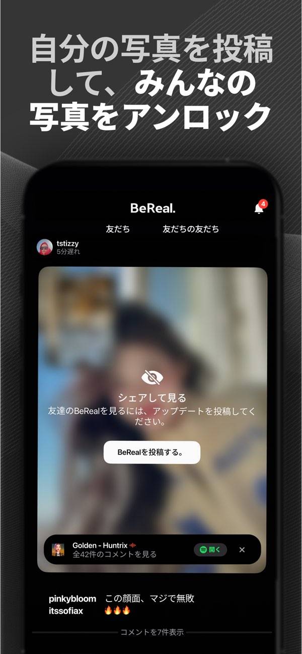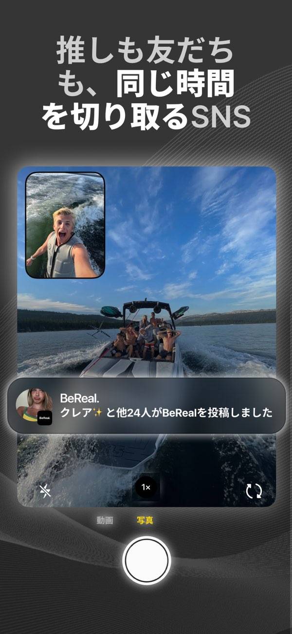 - 前面・背面カメラを使って写真を撮影。1日数回だけ投稿できるSNS