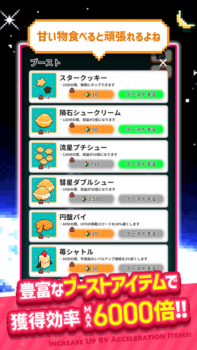 宇宙船をアップグレードすると、コインが貯まりやすくなります。放置してもコインが貯まる仕組みにするには、自動で増やせるアイテムが必須。またアイテムには1タップで貯まるコインが増額するものもあります。