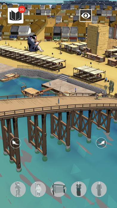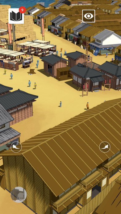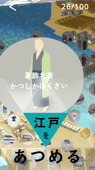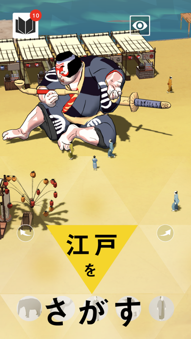 画面を長押し、またはタップで江戸の町を自由に散策。手描き風のデザインが。より世界観を盛り上げています。エリアは全部で4つあり、すべてのアイテムを集めると次のエリアがアンロックされる仕組み。