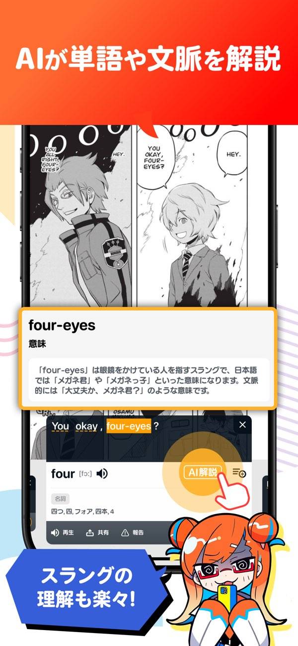 お気に入りのマンガを英語で読み進めることで、自然と英語力が身につくアプリです。英語量の調整や音声読み上げなど、スキルに応じた機能も充実。楽しく読みながら勉強できるので、教科書が苦手でも続けやすいですよ。