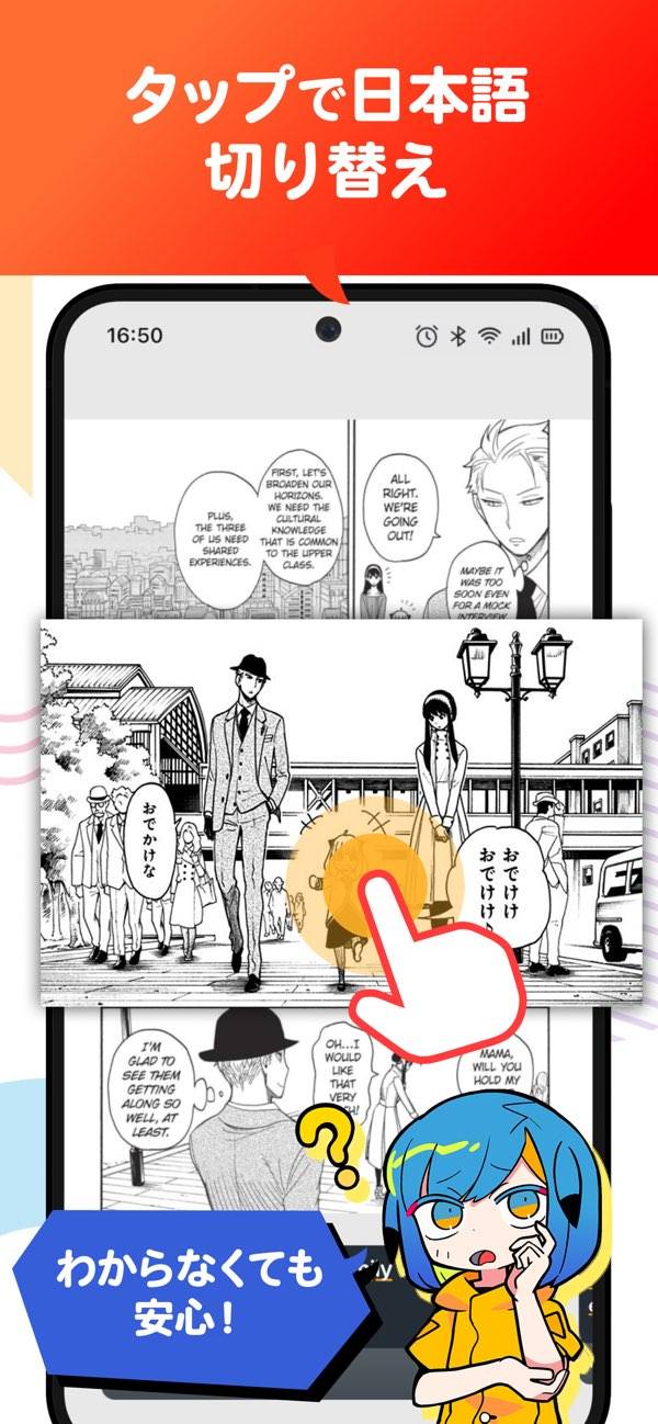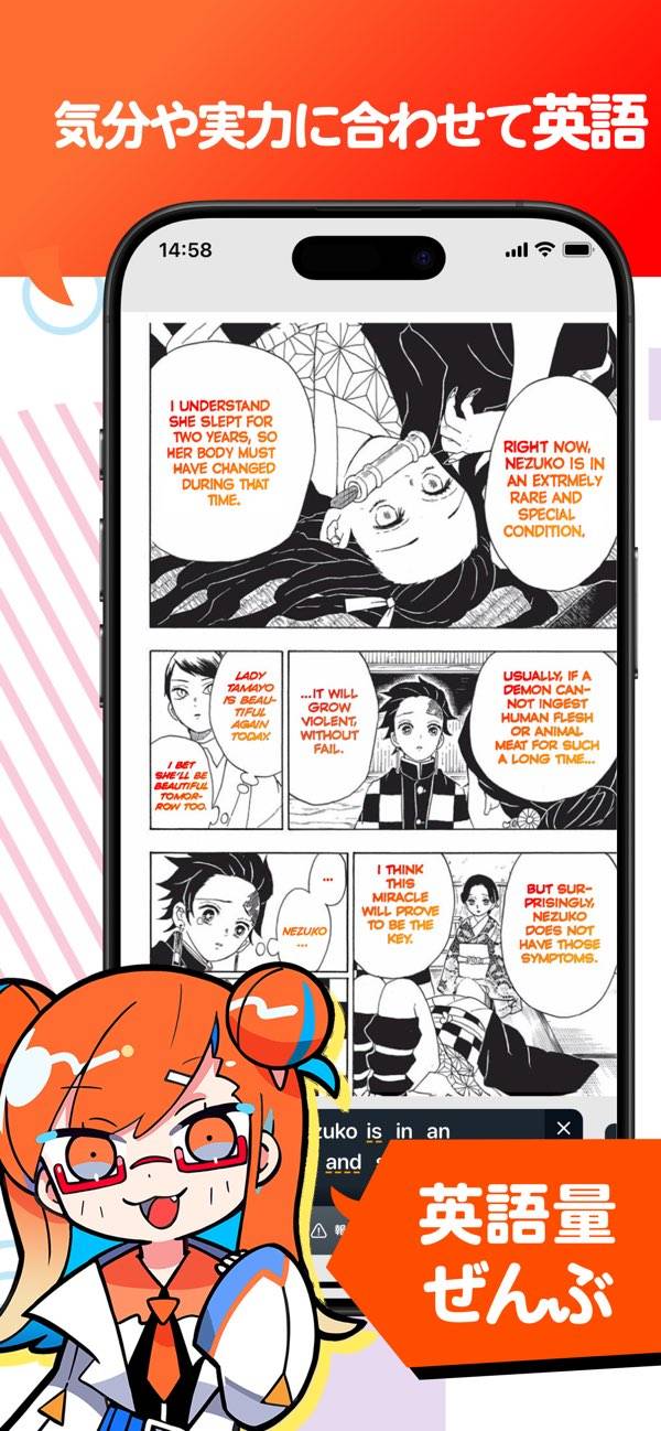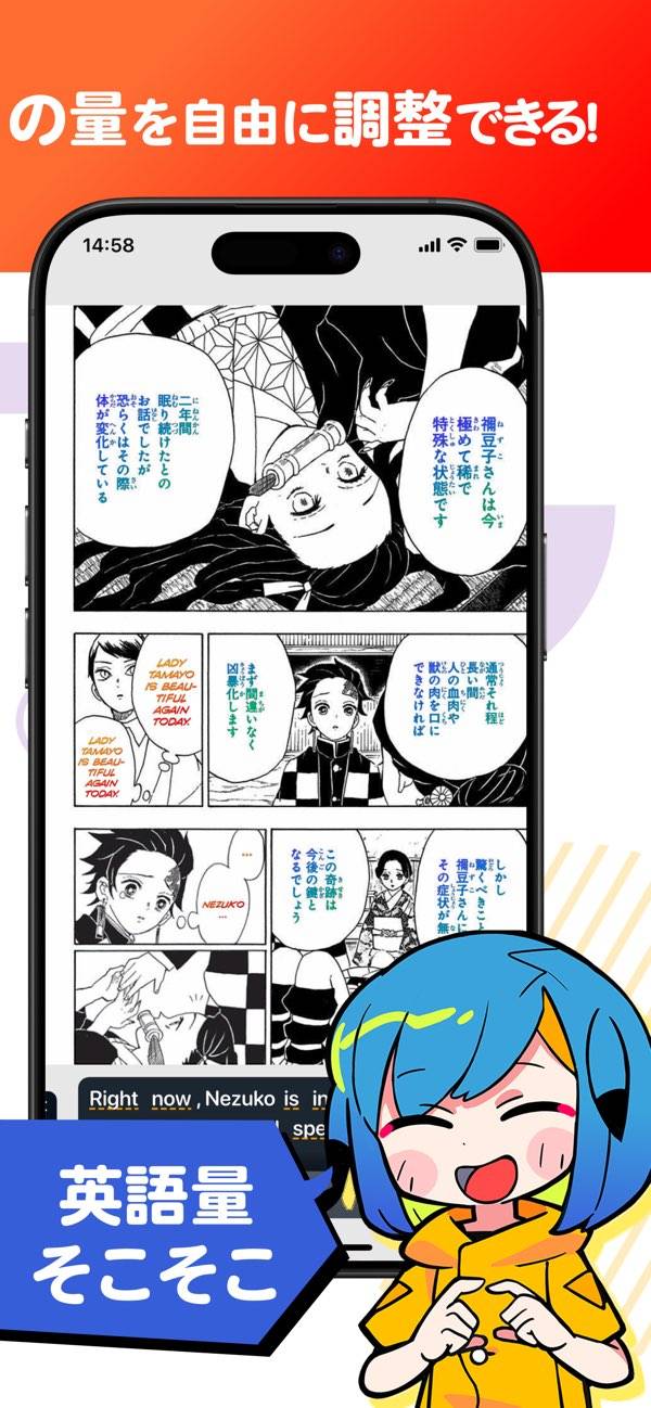 スパイファミリーと鬼滅はちゃんと読んだことなかったので英語学びがてらこのアプリで少しずつ読んでる わかんなくてもタップで切り替えて翻訳が見られるのも気楽だし、英語と日本語のニュアンスの違いとかスラングとかを知りながら読める 教科書みたいな「これはペンですか?」みたいなダルい文章がないのが何より魅力だと思う
