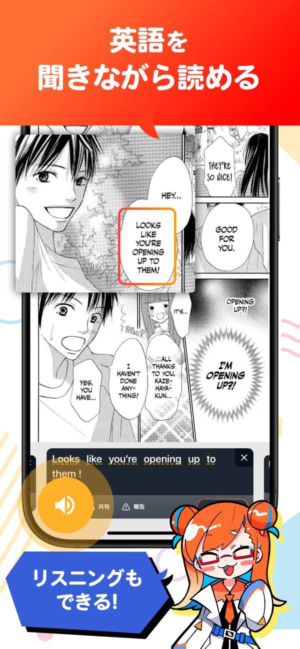 コマごとに音声再生できる読み上げ機能を使えば、目だけでなく耳でも英語に触れられます。登場人物の声で発音されることで、英語のニュアンスやイントネーションまでしっかり対応。リスニング力アップも間違いなし。