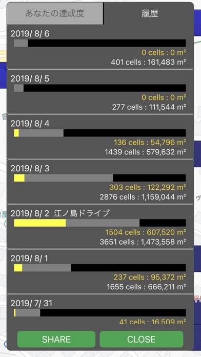▲通常の地図だけでなく、衛生画像でも見ることが可能。自分が通った場所が塗りつぶされていく。