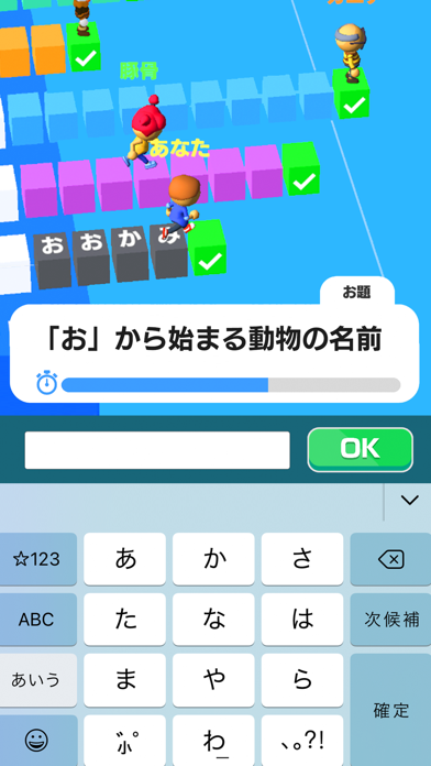 お題に対するワードをたくさん答える言葉ゲームです。答えたワードの文字数ぶん前に進むことができるレースで、己の知識とフリック入力の速度を駆使して勝ち残りましょう。動物の名前や寿司のネタなど、さまざまなお題が出題されるので、プレイしていると自然に語彙が増えているかもしれません。