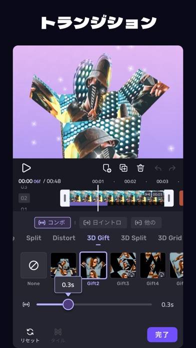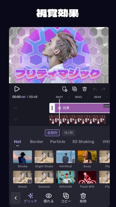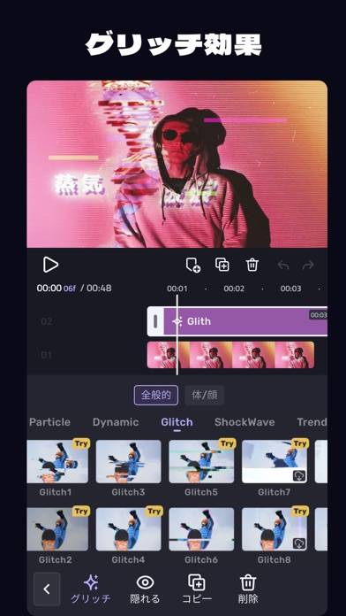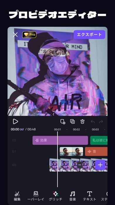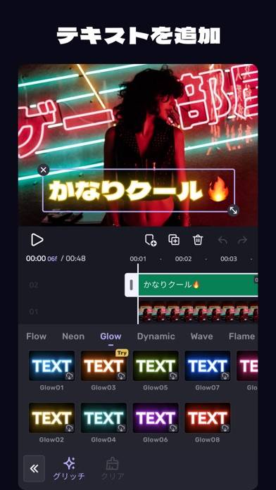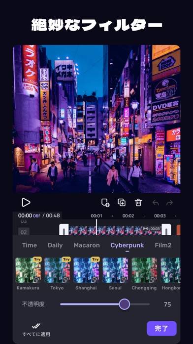 トランジションやフィルターを使い、ワンタップで完成度の高い動画が作れます。フィルターはレトロなものからサイバーパンクなど、一風変わったものが多いのが特徴。無料で利用できますが、すべての機能を使用するには月額課金が必要です。