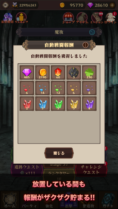 - アプリを閉じている間も、各種アイテムが自動で貯まる。周回の必要ナシ