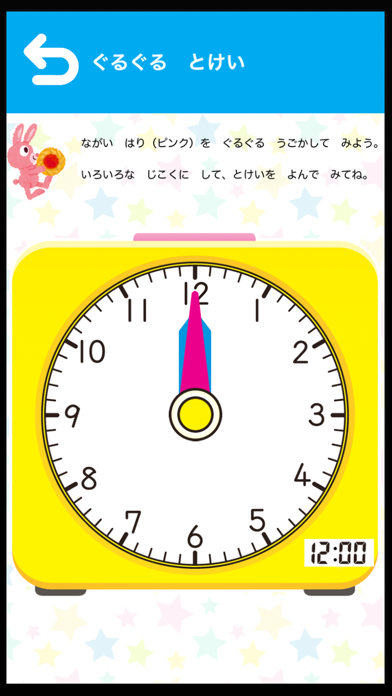 - 長針を動かして時間を読む”ぐるぐるとけい”機能。楽しく学べる