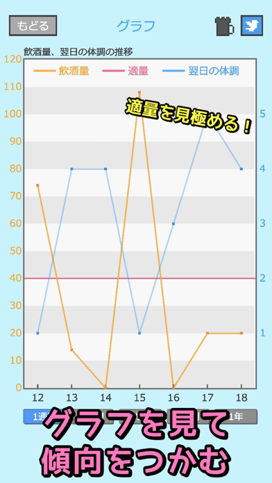 日々の記録は週単位で分析され、グラフを通じて飲酒の傾向や体調の変化を確認できます。視覚的にアプローチされることで、自分の行動を客観的に振り返れるのがポイント。