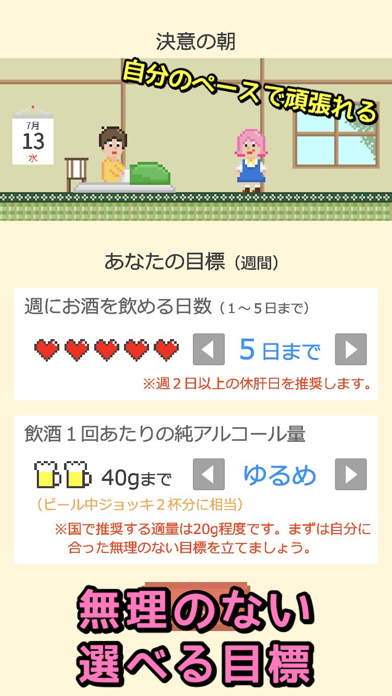 日々の飲酒量を守るとキャラが進化。「ただ記録するだけでは続かない」という人でも、ゲーム感覚でやる気が持続する設計になっています。