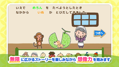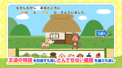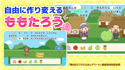 「家で桃を食べようとした時、中から鬼が飛び出してきました」というように、ストーリーを作り変えられるのが本アプリの特徴です。王道を目指すもよし、とんでもない展開を目指すもよし。自由な発想で、想像力を育みましょう!