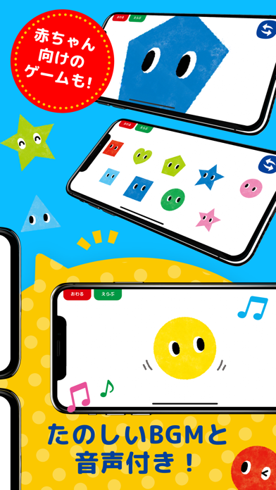 画面をタップして「形」や「色」の認識などを育ませられる知育アプリです。問題は「まるはどれかな?」というような簡単なもの。楽しく遊びながら、自分で考える力が身につくでしょう。1ゲーム60秒と短いため、ちょっとしたスキマ時間や外出時の待ち時間にもおすすめです。