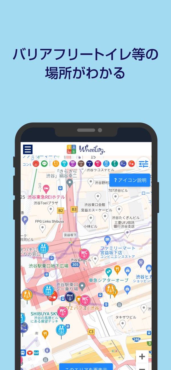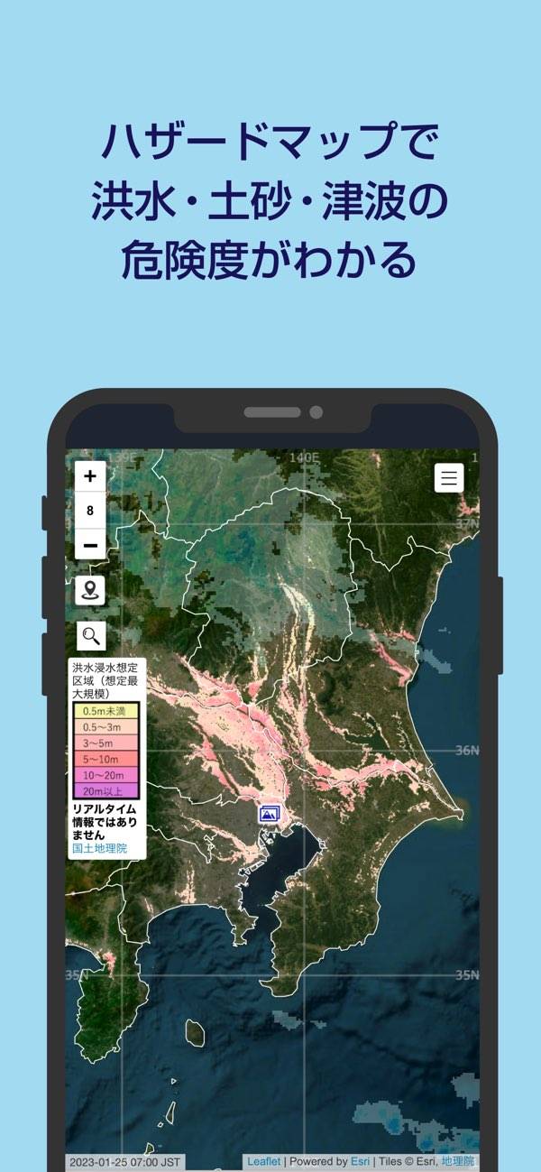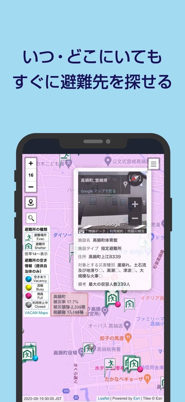 洪水・土砂・津波リスクを地図で見られるハザードマップとあわせて、避難所や避難場所をすぐ探すことができます。バリアフリー施設やトイレの場所も地図上で確認できるため、小さな子供や高齢の家族がいる家庭にも便利。普段から設定しておけば、いざというときもスムーズに避難できます。