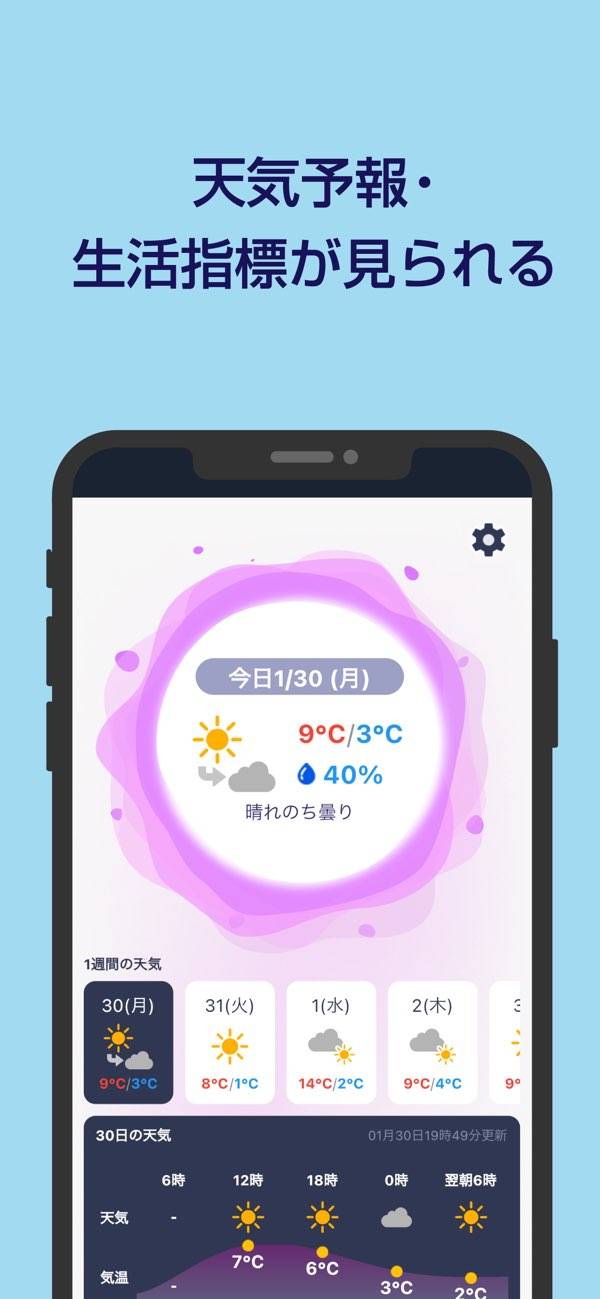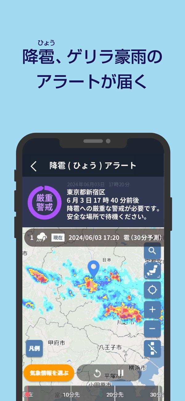 台風や豪雨、大雪などの災害リスクを事前に知らせてくれます。ゲリラ豪雨は最大60分前、降雹は30分前にプッシュ通知で警戒を促してくれるので、屋外にいるときでも落ち着いて対応可能。地震や水害などが発生した際には、取るべき行動をイラスト付きで教えてくれるのも安心材料のひとつです。