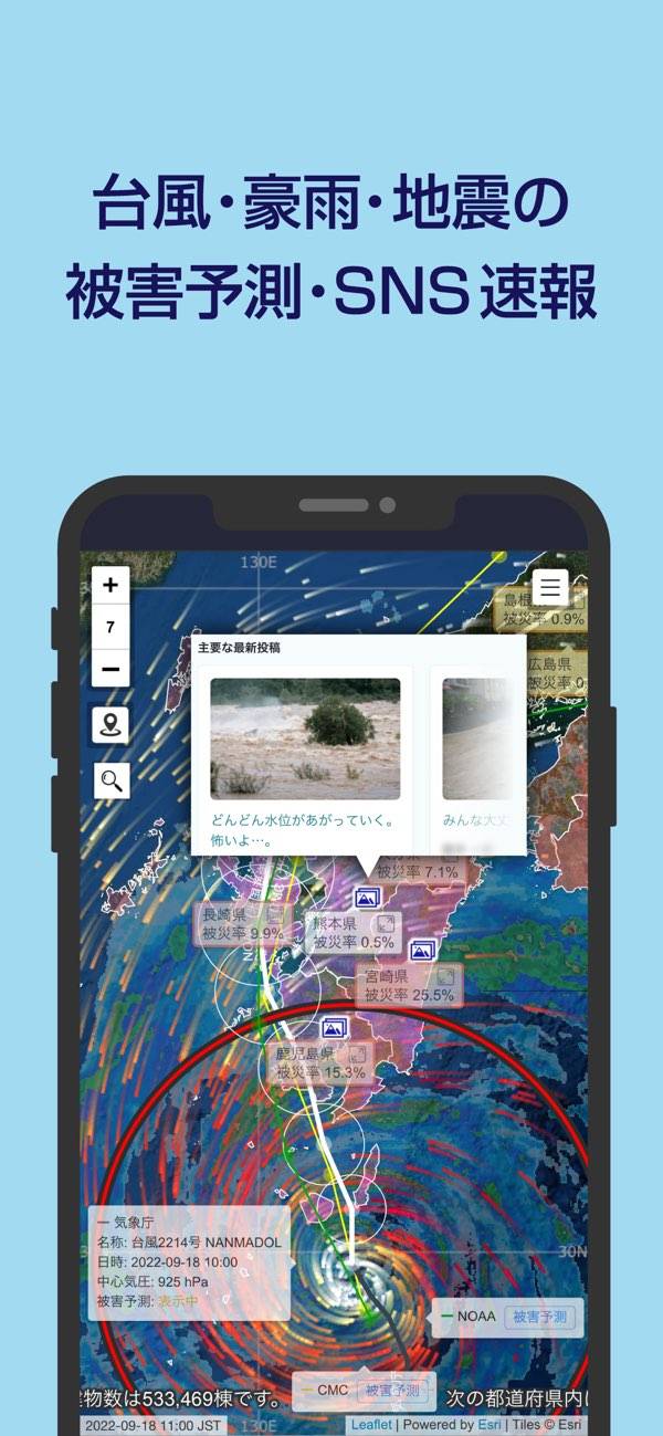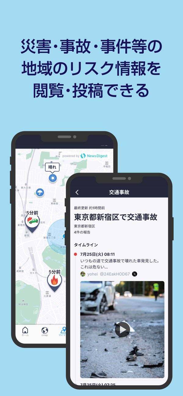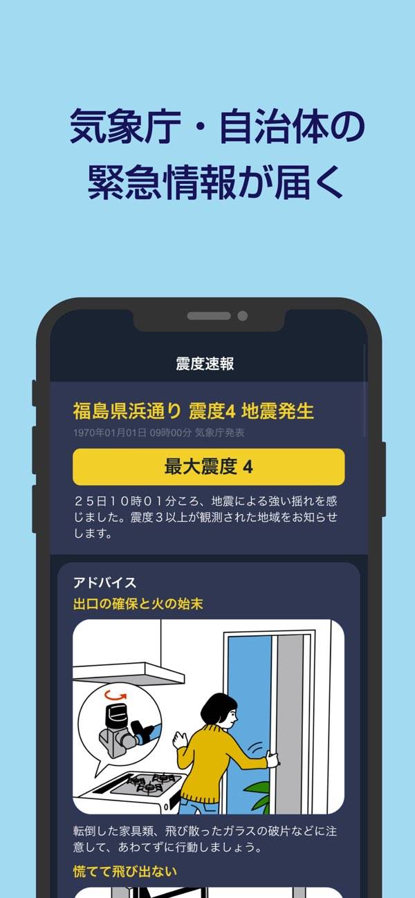 災害情報や避難先の場所をまとめてチェックできるアプリです。地震や豪雨、竜巻などの災害リスクを早ければ30分〜60分前に通知してくれるほか、避難指示やハザードマップ、SNSの現地情報もまるっと確認。家族のために備えておきたい人にぴったりの内容です。