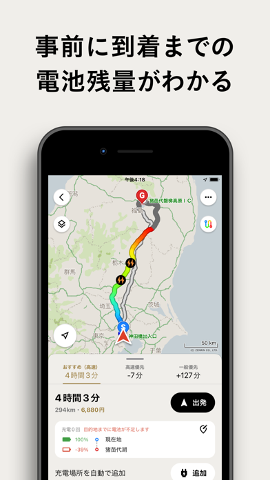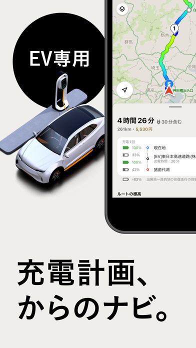 - 電気自動車(EV)専用のカーナビアプリ。ドライブを総合的にサポート